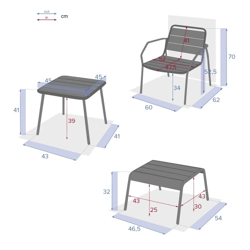 2 fauteuils (68x67xH70 cm) + 2 repose pieds (50x38xH32 cm) + 1 table basse (45x45xH41 cm).