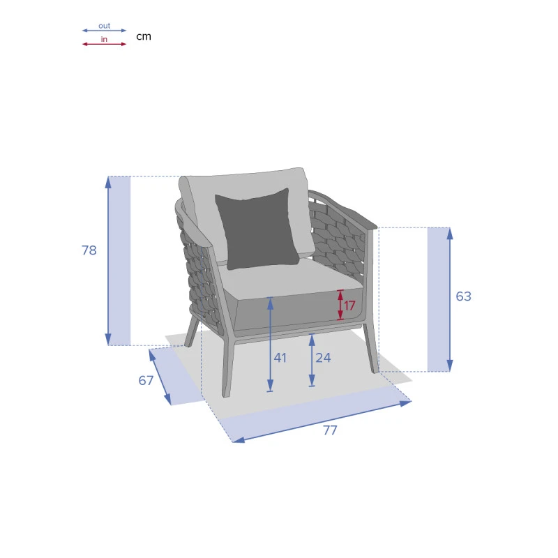 Conçu spécialement pour l’extérieur, la structure est en aluminium traité époxy antirouille et les coussins sont en polyester 240 g/m² traités déperlants.