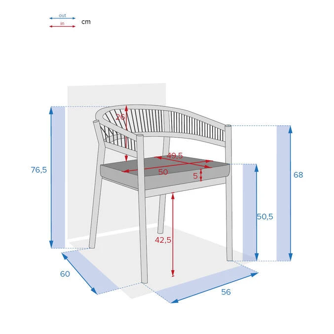 Ces sièges d’extérieur sont traités contre la décoloration due aux rayons UV. De plus, le tissu déperlant du coussin évite à l’eau de pénétrer la matière et donc de sécher plus rapidement.